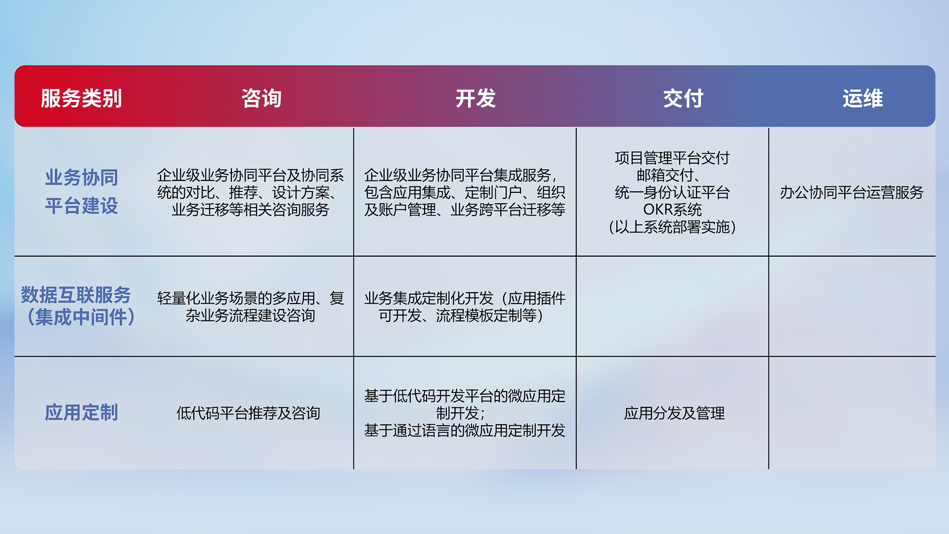 针对钉钉、、企微、、IDaas等平台级产品提供产品的规划、、、、方案、、、交付、、、定制化开发等服务,,,,实现如统一协同办公、、、智能客户服务、、、、混合会议管理、、智能数据查询、、、、等业务场景,,,实现数字化转型。。