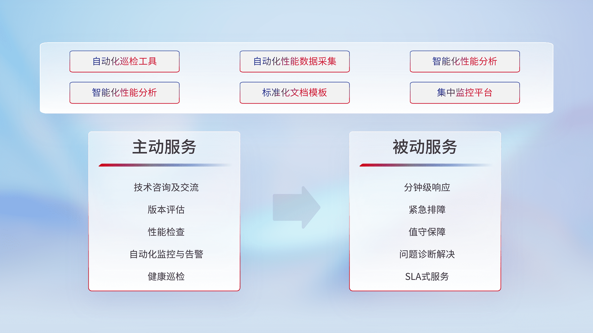 智能化工具和标准化文档,,,保障服务质量,,,提供主动服务(包含技术咨询、、版本评估、、、、性能检查、、自动化监控与告警、、健康巡检)和被动服务包含(分钟级响应、、、紧急排障、、值守保障、、问题诊断解决、、SLA服务)。。。。